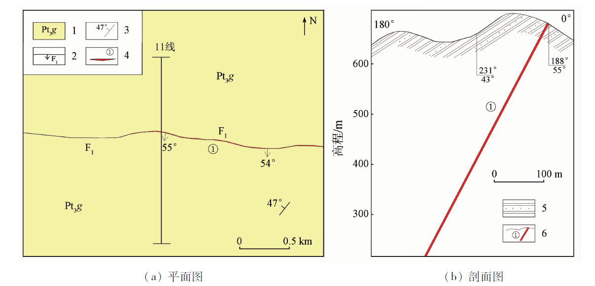 矿体赋存于呈近EW向展布的F1断层破碎带中(图2), 仅见1个矿体(编号①)。矿体与围岩界线清楚, 接触面平直, 局部呈舒缓波状。矿体平面形态呈长条状, 长约800 m, 走向近EW, 倾向南, 倾角58° ~61° , 剖面呈脉状、透镜体状, 少量呈似层状。矿体厚度1.51~2.36 m, 矿化不连续, 于脆性岩层中节理发育地段矿体明显变厚、品位变富。矿石品位为0.97%~3.08%[5]。