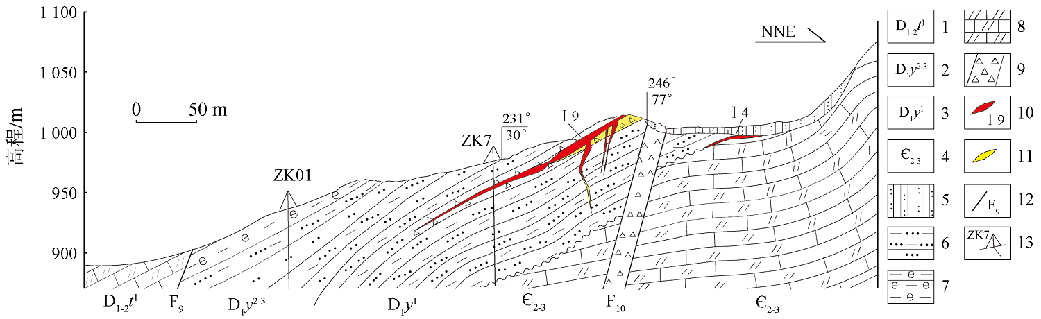 以桂西为例, 具有一定规模的矿床集中分布于隆林、西林一带。此类型锑矿床区域上位于滇黔桂被动陆缘南盘江— 右江裂谷盆地, 与微细粒型金矿有较密切的共(伴)生关系, NW向区域性断裂为主要的控矿构造, 矿床多位于区域性断裂带旁侧或区域性褶皱的次级褶皱转换部位, 锑矿体产于背斜轴部或近轴部的断裂带或次级断裂中。主要含矿层位为泥盆系、三叠系, 沉积环境以深水、半深水斜坡— 盆地相巨厚连续沉积为主。锑矿体规模大小不一, 呈似层状、脉状产出, 单矿体长度25~750 m, 斜深30~450 m, 矿体产状受层间破碎带及次级羽状裂隙产状控制。似层状矿体倾角一般较缓, 与地层倾角一致或略大于地层倾角, 单矿体规模往往较大(图6); 脉状矿体倾角较陡为70° ~88° , 多发育于似层状矿体下盘的次级羽状裂隙中, 单矿体规模较小, 变化大, 沿走向、倾向延伸, 常出现分支、复合、尖灭、再现等现象。矿石自然类型主要为硫化锑, 工业类型为石英(方解石)-辉锑矿型。矿石矿物组分简单, 主要金属硫化物矿物有辉锑矿、黄铁矿、毒砂等, 偶见有方铅矿、辉铜矿。脉石矿物有石英和方解石, 矿石主要有半自形— 自形结构、压碎结构、交代结构、条块状构造、带状(脉状)构造、角砾状构造及浸染状等。围岩蚀变较弱, 有硅化、黄铁矿化、毒砂化、碳酸盐化等, 弱硅化、黄铁矿化与锑矿化具有密切关系。