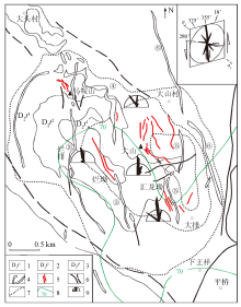 | 图2 罗城县黑刚锑矿区地质简图[5] 1.上元古界丹洲群拱洞组; 2.断层及编号; 3.产状; 4.平面上矿体及编号; 5.砂岩夹板岩; 6.剖面上矿体及编号。Fig.2 Geological sketch of Heigang antimony deposits in Luocheng County[5] |