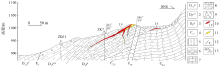 | 图6 隆林县坡岩锑矿区29号勘探线剖面[13] 1.中— 下泥盆统塘丁组下段; 2.下泥盆统郁江组第二、三段; 3.下泥盆统郁江组第一段; 4.中— 上寒武统; 5.浮土覆盖层; 6.泥质粉砂岩; 7.生物碎屑泥岩; 8.泥灰岩; 9.构造角砾岩; 10.锑矿体及编号; 11.矿化体; 12.断层及编号; 13.钻孔及编号。Fig.6 No.29 prospecting line section of Poyan antimony deposit in Longlin County[13] |