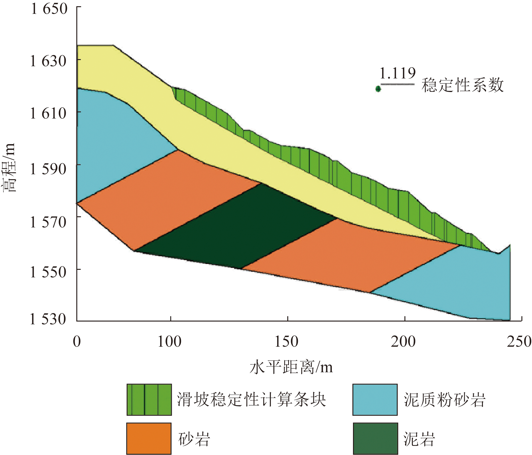 根据滑坡变形破坏特征及形成机制, 滑坡后缘已经下挫近3 m, 滑坡两侧裂缝下挫近2 m, 滑坡前沿从开挖面挤出, 滑坡体上出现多处裂缝及下挫, 滑坡两侧及后缘裂缝已全部贯通。由此可见, 该滑坡已处于欠稳定状态, 雨季前沿剪出口可见地下水从滑体大量渗出, 坡体上可见松散碎石土裹挟泥水往下滑移。如果边坡继续开挖, 或者遇到强降雨情况, 整个边坡将会整体滑移。