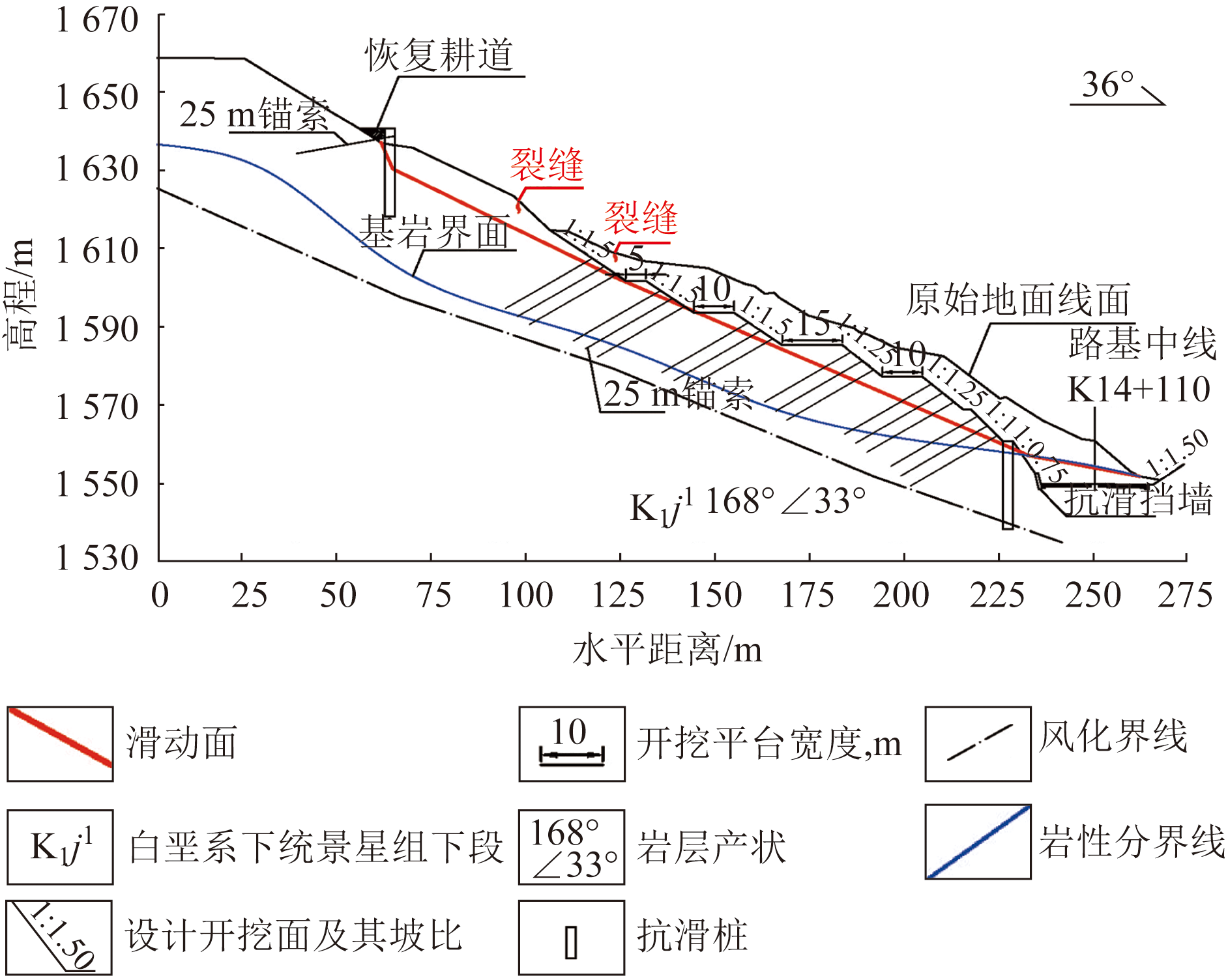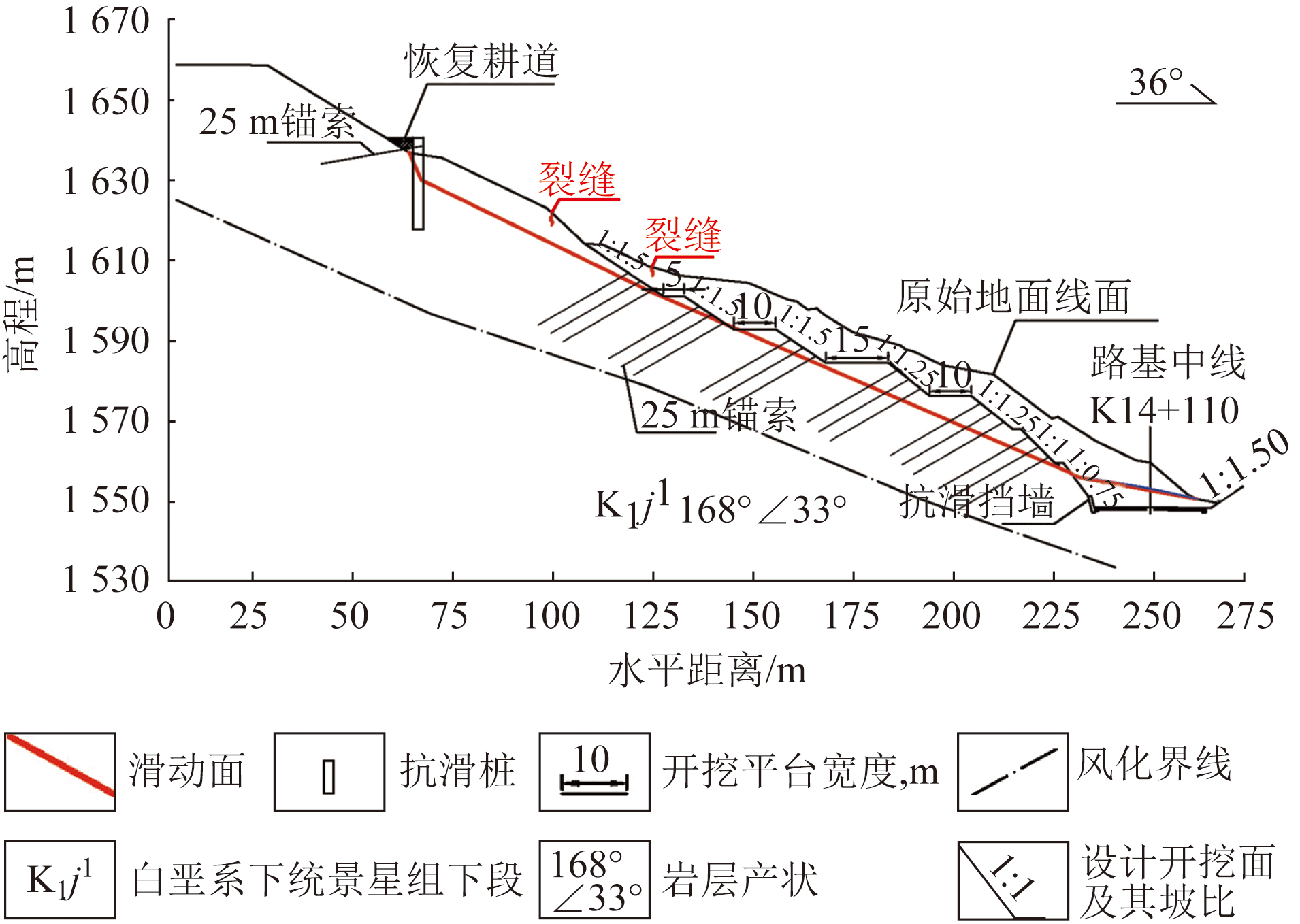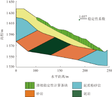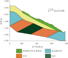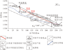 本次定量分析选择主滑断面(K14+110)作为计算坡面, 结合滑坡的影响因素, 进行天然工况、暴雨工况、地震工况下的滑坡稳定性分析。