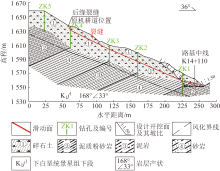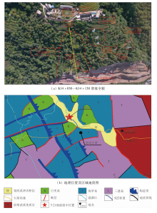 ![]() | 图1 K14+030— K14+130滑坡全貌、地理位置及区域地质图Fig.1 Landslide general view, geographic location and regional geologic map of K14+030— K14+130 section |