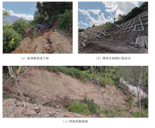该段斜坡自然坡度约24° ~35° , 整个滑坡体位于冲沟内, 冲沟地形较陡, 汇水明显, 整个滑体比较松散。路线左幅以挖方路堑形式从斜坡坡脚通过, 原设计最大中桩挖方深度为17.63 m, 开挖后左侧将形成高32.5 m的4级边坡, 按原设计开挖至3级边坡时, 坡面及坡脚处存在多处浅层滑塌, 坡体上部山体出现大量裂缝及错台, 裂缝目前已经形成闭合的弧形(图1(a))。原本坡顶175 m左右宽度的机耕道被破坏, 并发生下挫, 路基发生严重坍塌(图2(a)), 坡脚位置可见明显挤出(图2(b)), 滑坡两侧也形成大量裂缝, 裂缝最大下挫近2 m(图2(c)), 目前滑坡体已有整体滑动的趋势。整个滑塌体纵向长约180 m, 宽约100 m, 滑动面平均深度约7.5 m, 滑坡体体积为1.62× 105 m3, 主滑动方向为36° 。该段公路右侧为桥梁工程, 该滑坡一旦失稳会威胁右幅已建成桥梁的安全, 同时, 滑坡威胁到机耕道上部一新建农家乐及旁边三颗高压铁塔(其中两颗高压铁塔为大保铁路专线用电铁塔)。