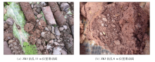 (3)ZK3。0~6 m高程范围内, 动力触探平均值为4.9; 6~23 m高程范围内, 动力触探平均值为21.1; 23 m位置以下钻孔岩心为强风化粉砂质泥岩。因此判定0~6 m 段落碎石土为松散状, 6~23 m 段落碎石土为密实状。从岩心外观上看, 0~6 m段落碎石土颜色主要为褐红色, 碎石成分主要为小粒径碎石为主, 外观判定堆积年代较新, 而6~23 m段碎石成分粒径多数大于6 cm, 0~6 m段的钻进速度明显比6~23 m段的钻进速度快。结合钻孔岩心照片, 在6 m位置可见岩心有明显的擦痕, 碎石颗粒有定向排列的趋势(图4(b)), 因此综合判定ZK3的滑面位置在6 m位置。