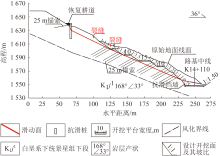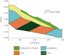 其中, 暴雨工况下考虑了渗流对滑坡的稳定性影响, 地震工况下水平地震力为0.2 g, 垂直地震力为0.1 g。根据稳定性分析结果, 在天然工况下, 滑坡处于基本稳定状态, 在暴雨工况下, 滑坡处于欠稳定状态, 在地震工况下, 滑坡将处于不稳定状态。同时通过计算也可以看出, 对滑坡稳定性影响最大的因素是地震。